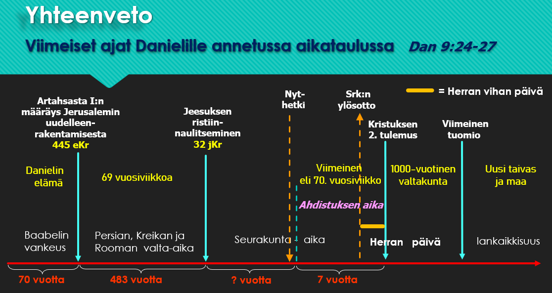 Alla olevassa kaaviossa seurakunnan ylöstempaus Jeesuksen tykö on arvioitu tapahtuvaksi Danielin viimeisen vuosiviikon puolenvälin jälkeen. Sanantutkijoiden keskellä vallitsevia vaihtoehtoja seurakunnan kotiin-kutsun ajankohdasta olemme tutkineet sivulla C4.8.