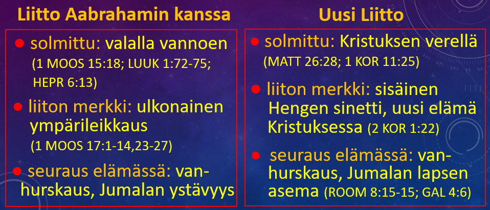 Ympärileikkauksen liitto Aabrahamin kanssa on esikuva paremmasta uudesta liitosta, jonka Jumala on Kristuksen sovintoveren kautta tehnyt niiden kanssa, jotka uskovat Jeesukseen (APT 7:8; 1 KOR 11:25).